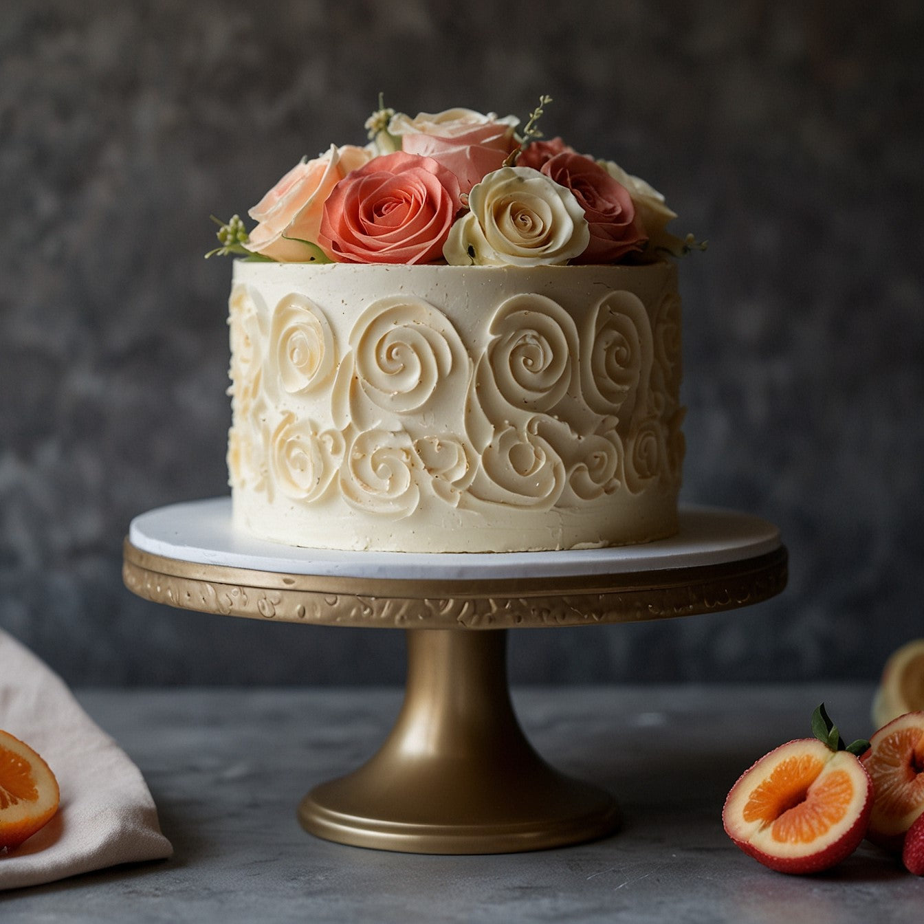 Varje bröllopstårta är unik, med en eller flera våningar, klädd i elfenbensvit buttercream. Varje våning pryds med delikat piping, kanske i form av blommor, bladrankor eller geometriska mönster. Fina detaljer som pärlor eller glittrande strössel kan ge en extra touch av lyx.